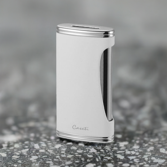 The BigFlat, it's smooth, white finish with chrome accents creates a striking appearance that sets it apart from ordinary lighters. A simple push against the chrome side reveals the lighter's innovative flat flame, offering a unique and practical experience for the discerning cigar aficionado.