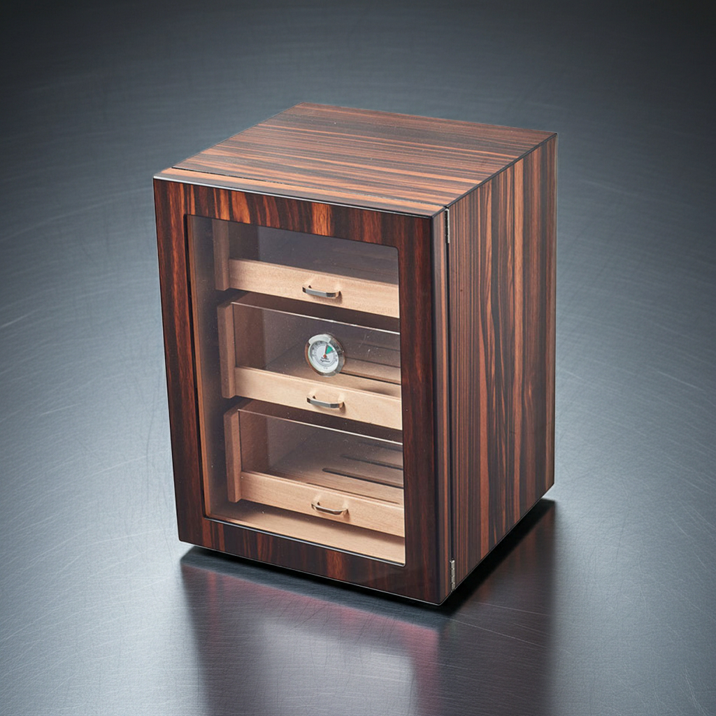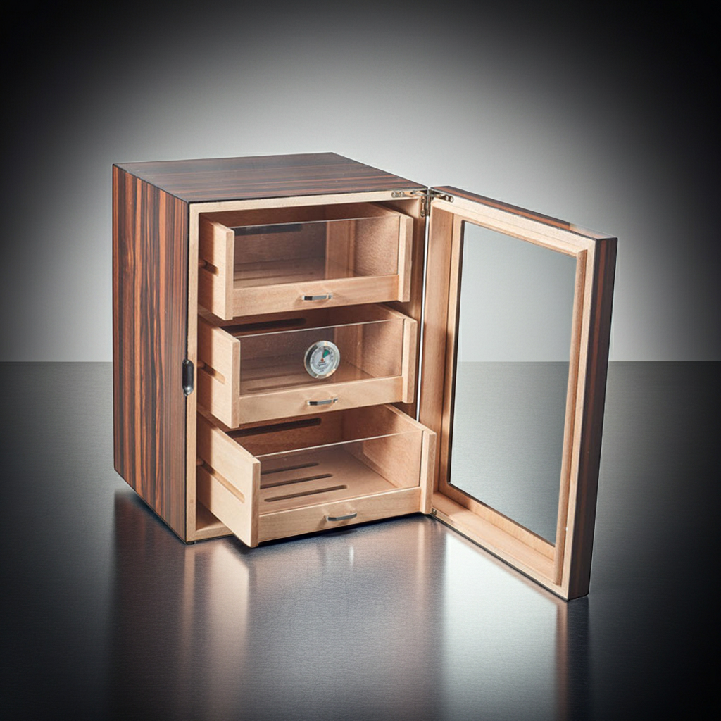- Ample Storage: Holds up to 150 cigars across three organized drawers
