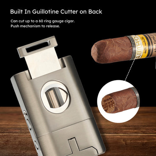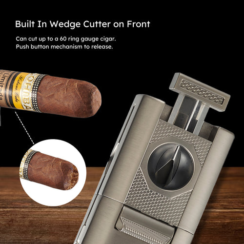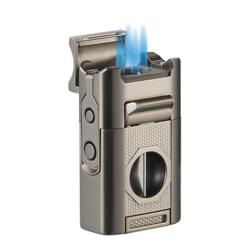 As seen on Cigar Aficionado – meet the Joplin Quad Torch in Gunmetal – a modern, all-in-one lighter designed for the refined cigar enthusiast. Featuring four wind-resistant flames and built-in cigar tools, it delivers performance and style whether you're at home or on the go.