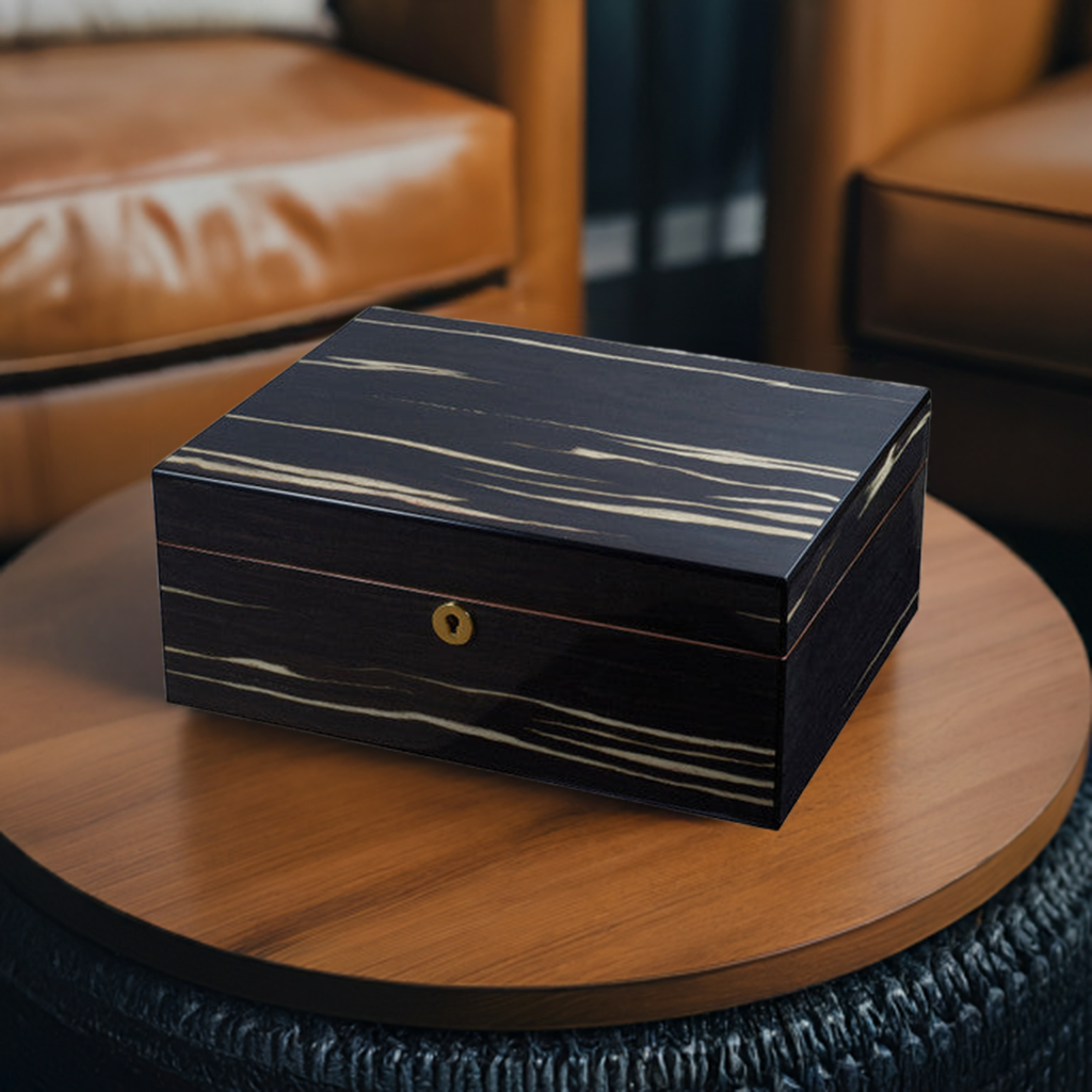Elegance and security unite in the Visol Remo Humidor, a refined showcase for your cigar collection. Crafted from polished ashburl wood with brass accents, it offers both beauty and function.