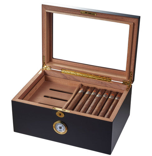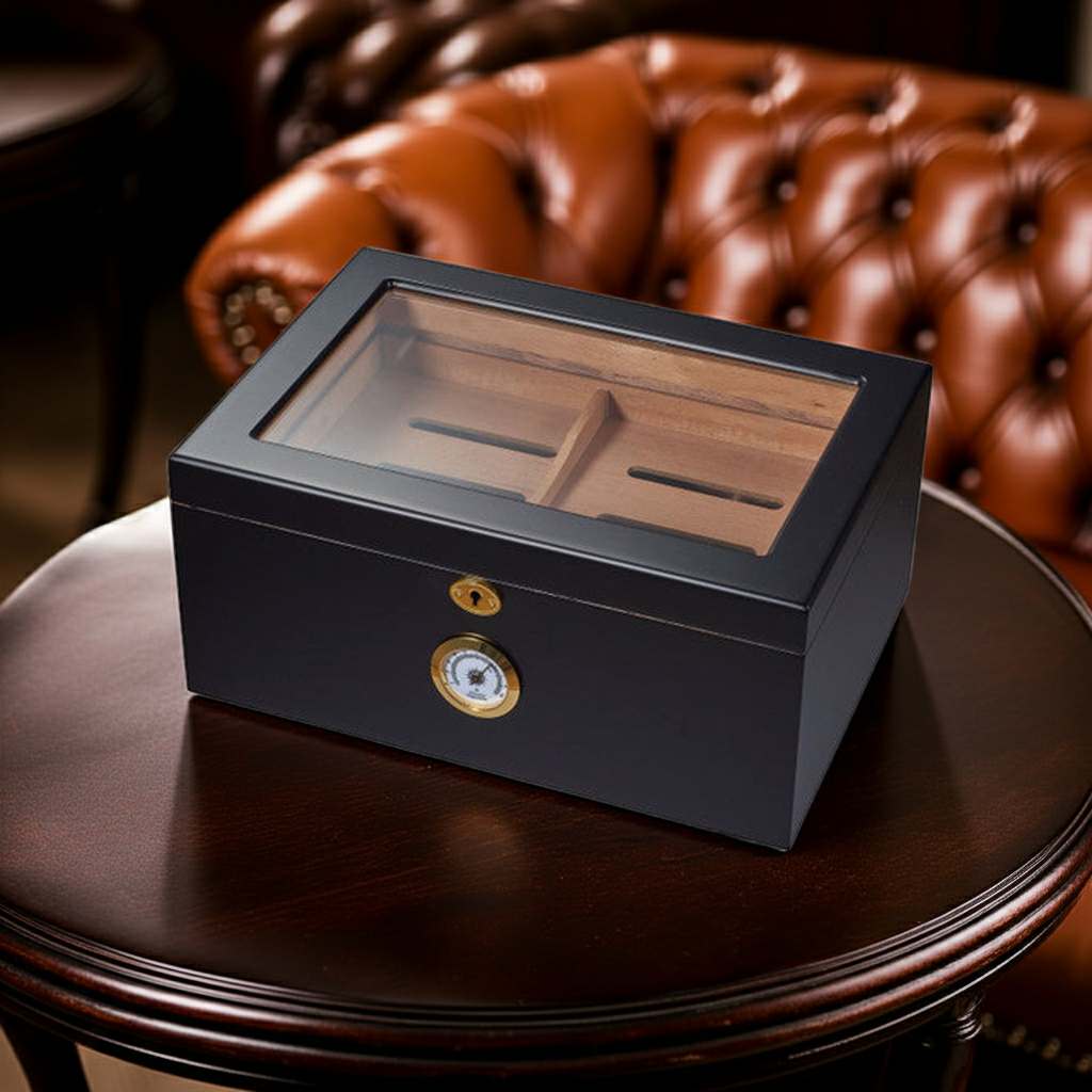Elevate your cigar storage with the Visol Rainier Glass Top Humidor - a sleek black matte design paired with a glass top to showcase your collection in style.