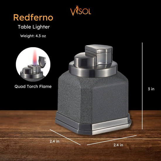 Bold, powerful, and refined - the Redferno Gunmetal by Visol is a tabletop statement piece that elevates every cigar session. Its black crackle finish with gunmetal accents exudes industrial elegance, while the quad jet flames ensure a flawless, even light every time.
