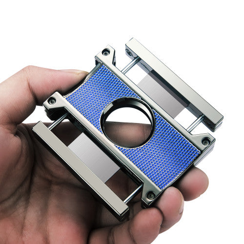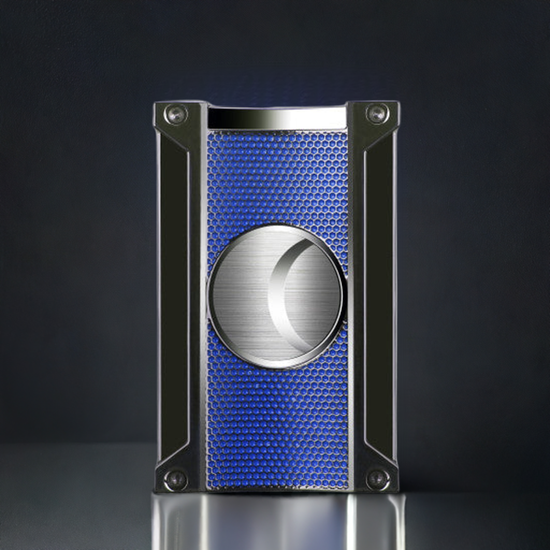 Introducing the Visol Ridge Cutter: This double guillotine cutter is designed to offer the perfect cut, accommodating cigars up to a 60-ring gauge with effortless ease. Its striking blue finish, complemented by gunmetal accents, exudes a refined elegance that makes it a standout piece in any collection.