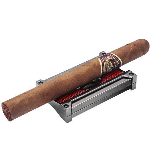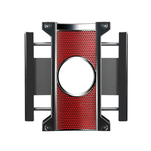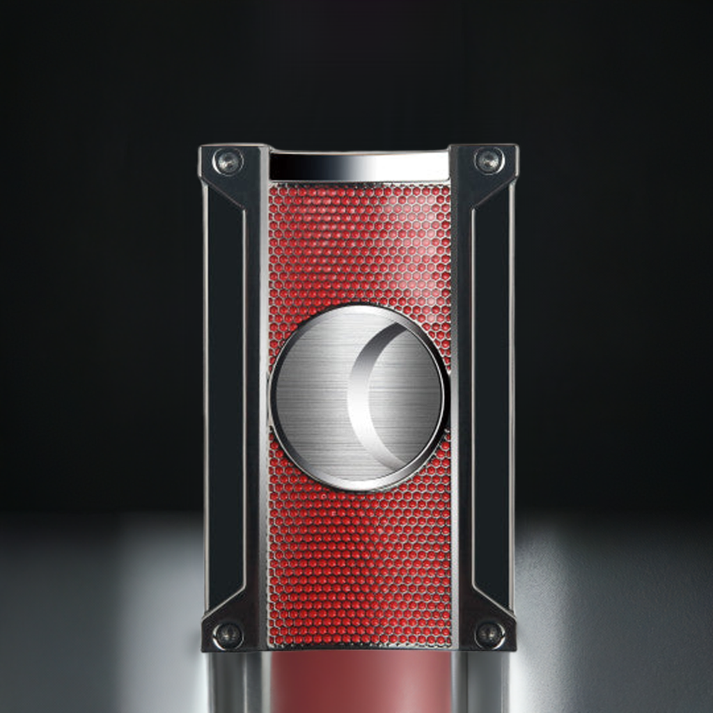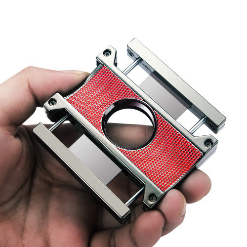 Introducing the Visol Ridge Cutter: This double guillotine cutter is designed to offer the perfect cut, accommodating cigars up to a 60-ring gauge with effortless ease. Its striking red finish, complemented by gunmetal accents, exudes a refined elegance that makes it a standout piece in any collection.